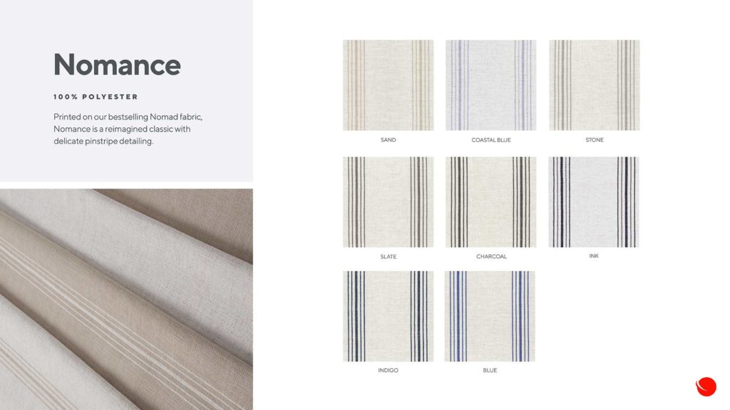 Look Book Page Nomance Click image to view or download 100% Polyester. Printed on our best selling Nomad fabric, Nomance is a reimagined classic with delicate pinstripe detailing ColorSelect…Aqua/TealBeige/TanBlackBlueBrownCoral/PeachGreenGrey/SilverMulti ColorOrangePinkPurpleRedRustWhite/Off WhiteYellow/Gold Reset filters Nomance Blue Nomance Charcoal Nomance Coastal Blue Nomance Indigo Nomance Ink Nomance Sand Nomance Slate Nomance Stone Select…Sort by title (Z-A)Sort by title (A-Z)Sort by newestSort by oldest