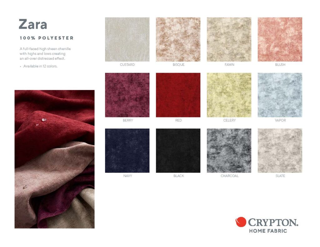 Look BookHero ImageHero Image Zara Click image to view or download 100% Polyester A full-faced high sheen chenille with highs and lows creating an all-over distressed effect Crypton Home Tech Spec Nanotex Tech Spec ColorSelect…Aqua/TealBeige/TanBlackBlueBrownCoral/PeachGreenGrey/SilverMulti ColorOrangePinkPurpleRedRustWhite/Off WhiteYellow/Gold Reset filters Zara Berry Zara Bisque Zara Black Zara Blush Zara Celery Zara Charcoal Zara Custard Zara Fawn Zara Navy Zara Red Zara Slate Zara Vapor Select…Sort by title (Z-A)Sort by title (A-Z)Sort by newestSort by oldest