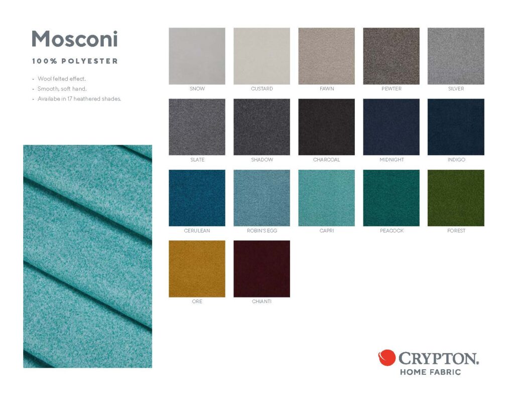 Look Book Mosconi Click image to view or download Wool felted effect Smooth, soft hand Available in 17 heathered shades Crypton Home Tech Spec Nanotex Tech Spec ColorSelect…Aqua/TealBeige/TanBlackBlueBrownCoral/PeachGreenGrey/SilverMulti ColorOrangePinkPurpleRedRustWhite/Off WhiteYellow/Gold Reset filters Mosconi Capri Mosconi Capri – Rolled Mosconi Cerulean Mosconi Cerulean – Rolled Mosconi Charcoal Mosconi Charcoal – Rolled Mosconi Chianti Mosconi Chianti – Rolled Mosconi Custard Mosconi Custard – Rolled Mosconi Fawn Mosconi Fawn – Rolled Mosconi Forest Mosconi Forest – Rolled Mosconi Indigo Mosconi Indigo – Rolled Mosconi Midnight Mosconi Midnight – Rolled Mosconi Ore Mosconi Ore – Rolled Mosconi Peacock Mosconi Peacock – Rolled Mosconi Pewter Mosconi Pewter – Rolled Mosconi Robin’s Egg Mosconi Robin’s Egg – Rolled Mosconi Shadow Mosconi Shadow – Rolled Mosconi Silver Mosconi Silver – Rolled Mosconi Slate Mosconi Slate – Rolled Mosconi Snow Mosconi Snow – Rolled Select…Sort by title (Z-A)Sort by title (A-Z)Sort by newestSort by oldest